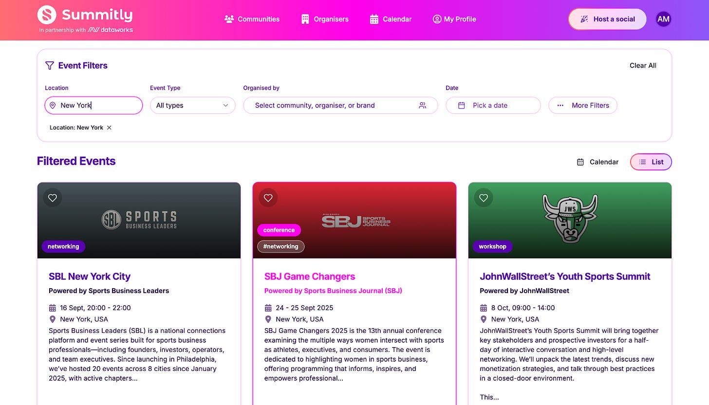 “Summitly fixes that by putting everything in one place, whether it’s the big-ticket conferences or the grassroots meetups that really make an impact.”